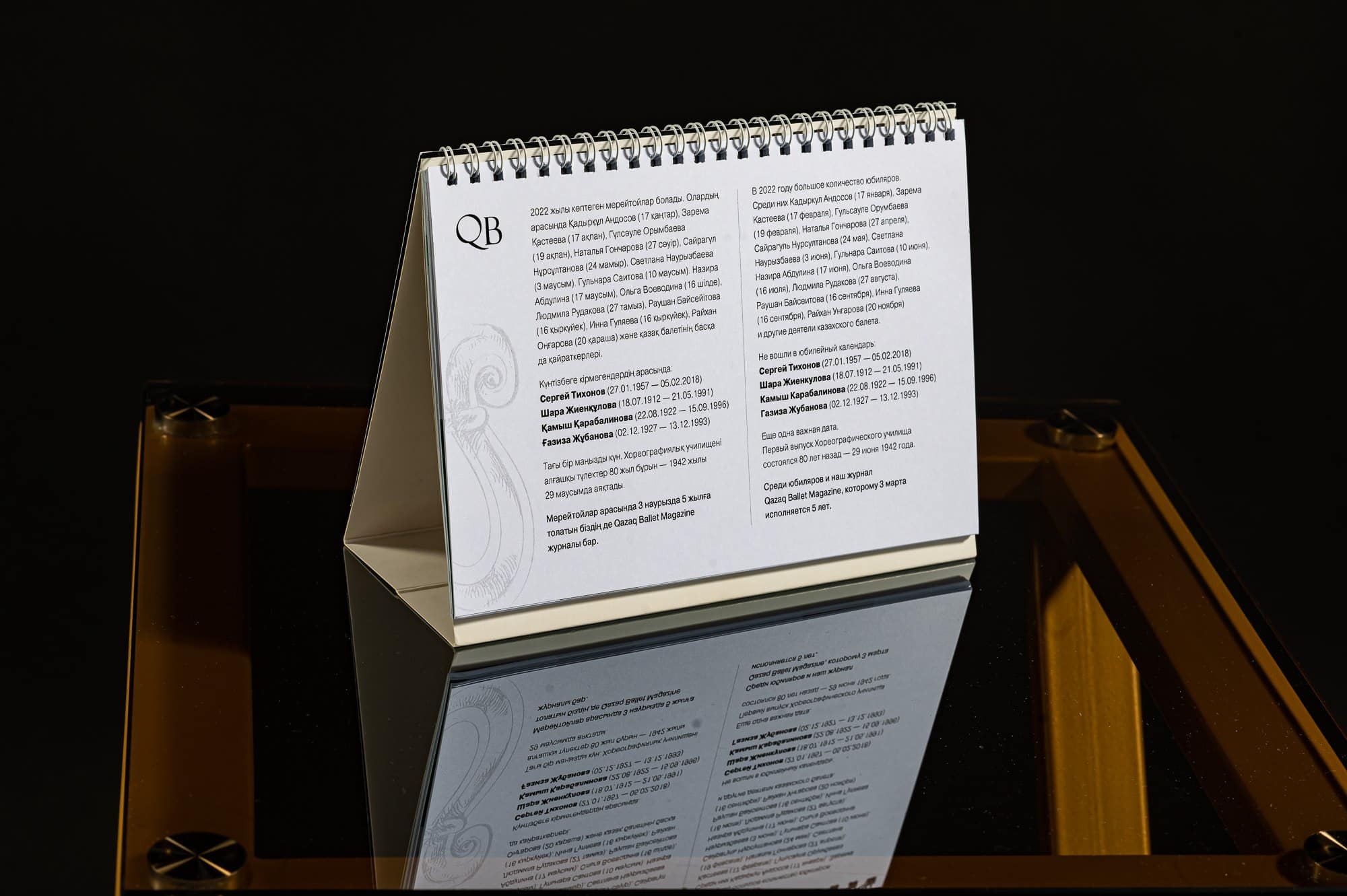 The creation of the calendar required comprehensive scholarly and organisational work: meticulous verification of archival sources, critical analysis of literature, comparison of photographic and documentary materials, and the structuring of information within a historical and cultural context. The edition features artists, directors, librettists, choreographers, designers, and researchers whose work shaped the formation and institutionalisation of Kazakh ballet.